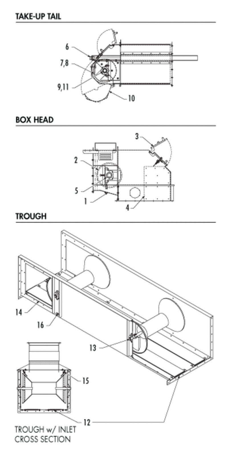 6. Two screw 24" long takeup tail. Screws are accessed from the back and allow for 360° degree wrench swing. Support arms slide in UHMW guides. Oversize acme takeup screws are plated for rust resistance and run in a relubricateable brass nut.